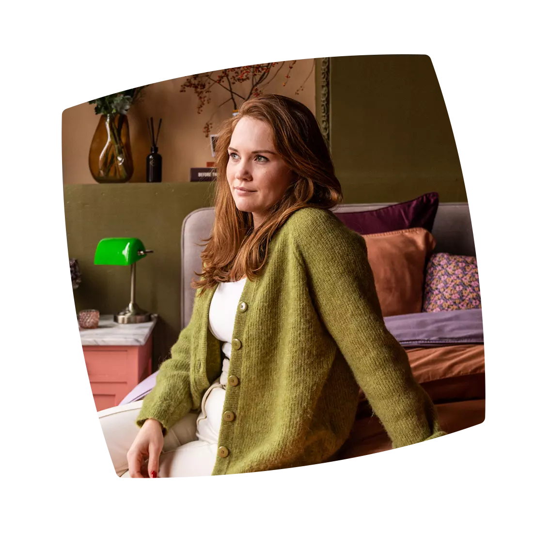 Die Wände und Decke des Schlafzimmers strich Doortje in hellen Pastellfarben und setzte den Kamin im kontrastreichen grün ab. „Daran platzierten wir das Boxspringbett. Zunächst aus der Not geboren, da das Zimmer eigentlich keine passende Wand bietet, um ein Bett hinzustellen.“ Beleuchtung, Deko und Accessoires shoppte Doortje in kleinen Secondhandländen in Amsterdam. „Auch im Urlaub fand ich immer wieder nette Dekoelemente – zum Beispiel die raumhohen Vorhänge im Hotel-Chic-Stil.“
